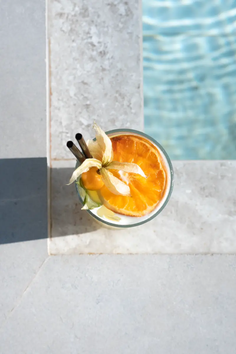 Dive into our swimming pool, which offers panoramic views of the sea.